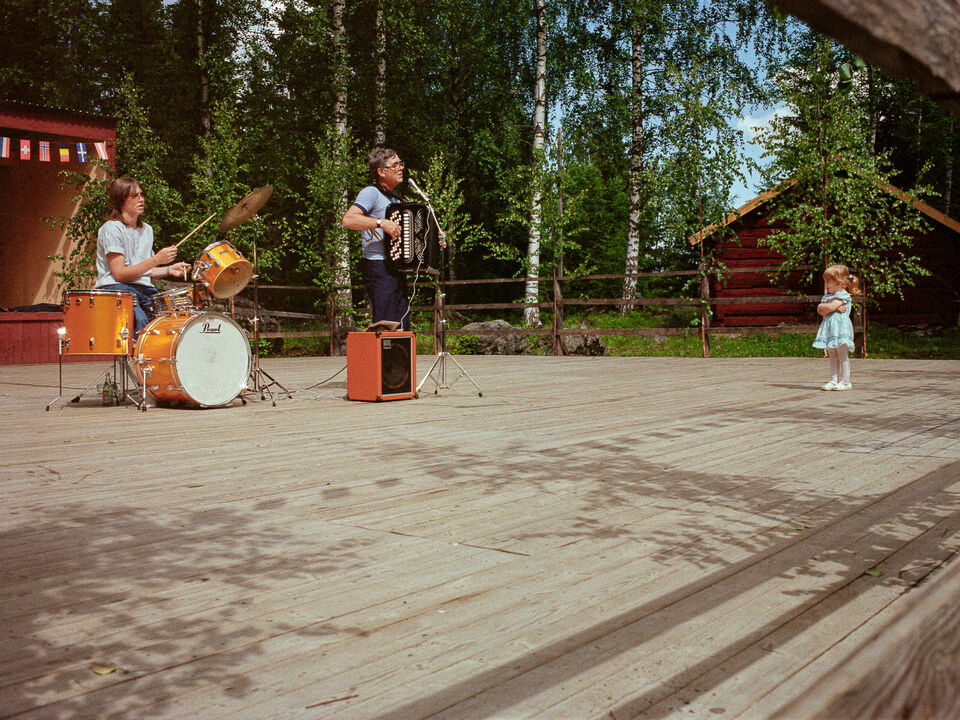 Midsommarafton på Hamrånge hembygdsgård. En dragspelare, en trummis och en liten tös som lyssnar på musiken. Musikerna har ställt sig på dansbanan i stället för estraden i bakgrunden för att komma ... läs mer..